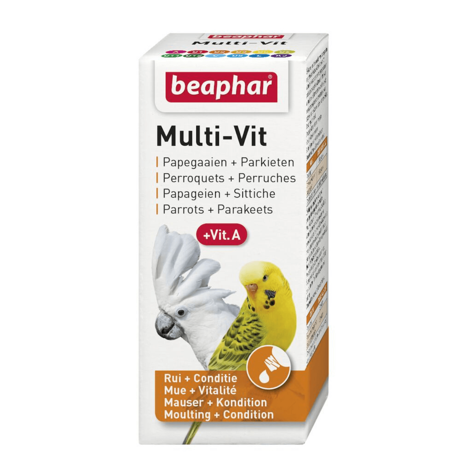 Multi-Vit papegaaien + grote parkiet bevat 12 verschillende soorten vitaminen waaronder de voor papegaaien en parkieten belangrijke vitamine A.